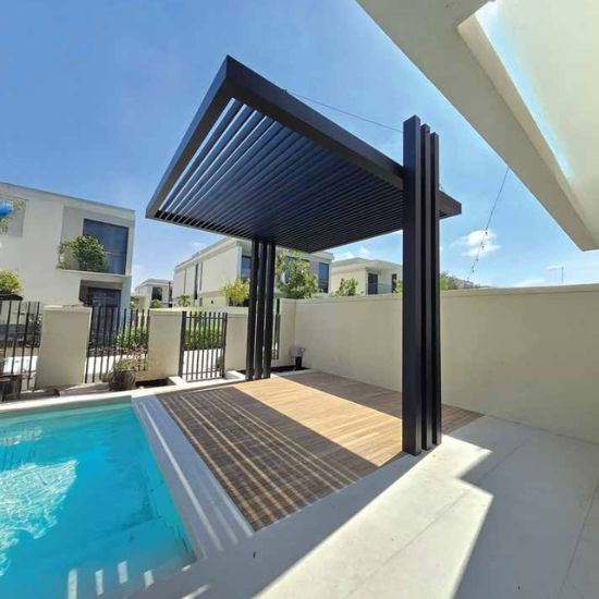 Stylish, weather-ready pergolas with lighting, fans, privacy screens, and roofing options.